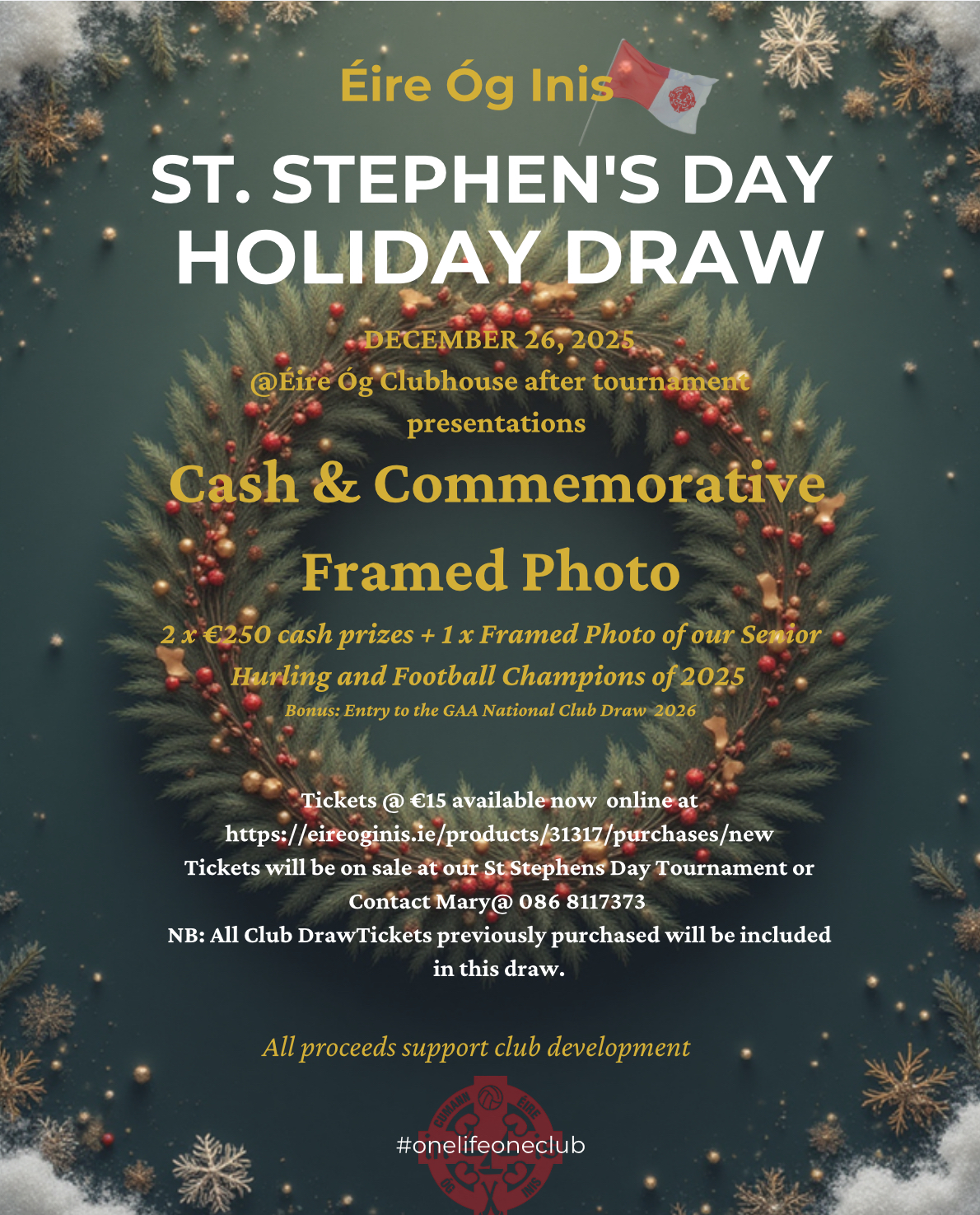 Tickets are now available for our St Stephens Day Draw. 2 x €250 cash prizes and 1 x framed Commemorative Photo of our Senior Hurling and Football Champions of 2025